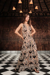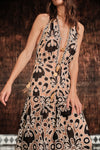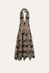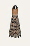 A halter dress cut in intricate eyelet cotton featuring bold floral embroidery. Its airy construction and open back evoke effortless sophistication—perfect for warm days or outdoor gatherings.