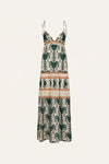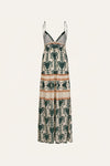 A strappy maxi dress cut in light poplin, in ecru and green with a JO print. Defined by a plunging neckline, tiered silhouette, and shell-trim detail at the waist. Designed for effortless warm-weather dressing.