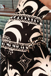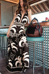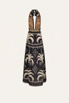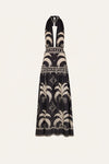 A halter maxi dress cut in light poplin, in black and ecru with a JO print. Defined by a plunging neckline, open back, and tiered skirt with shell-trim accents. A statement silhouette designed for warm-weather occasions.