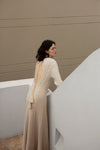 Styling Notes: This knitted dress exudes elegance with its long, fitted silhouette. It features a striking cable-knit design that runs vertically, elongating the figure. The front offers a classic, high-neck look, while the back reveals a deep, open back with delicate ties that finish in playful tassels, adding a subtle yet bold touch of femininity.