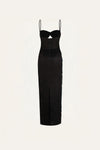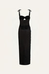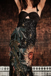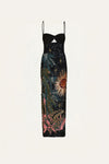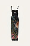 A statement maxi dress intricately embroidered with vibrant botanical motifs. Designed with a structured bodice, delicate bows, and removable straps for versatile styling. A true occasion piece that captures the collection’s artisanal craftsmanship.