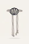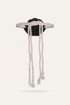 A belt crafted from leather and cotton, featuring a seashell-inspired centerpiece with braided ties. Its artisanal design makes it a statement accessory, perfect for layering over dresses, kaftans, and pareos.