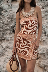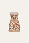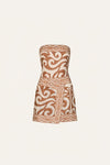 A strapless linen mini dress featuring a JO print in camel and ecru. Defined by its straight neckline, fitted bodice, and wrap-effect skirt with patch pocket detailing. A playful yet refined silhouette designed for warm-weather dressing.