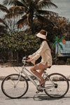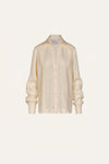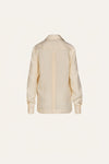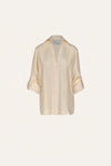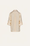 A button-down shirt in organic linen, inspired by the classic guayabera. Cut in ecru with subtle pintuck details, it features a relaxed silhouette with long sleeves and a sharp collar. A versatile piece to be worn with swimsuits or styled with other bottoms from the collection.
