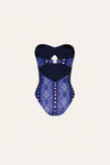 A strapless one-piece swimsuit with a heart-shaped neckline and subtle front cutout. Defined by clean lines and soft ruching at the sides, it combines ease and sophistication for a statement swimwear piece.