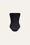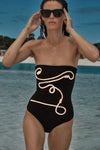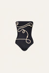 A classic Johanna Ortiz one-piece swimsuit in black, featuring rope-style detailing that winds gracefully across the body. A striking silhouette that brings a statement-making touch to any beachside look.