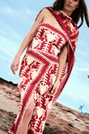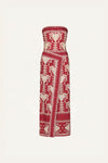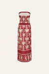 A strapless linen ankle-length dress featuring a bold JO print. Designed with a wrap-effect silhouette and a side slit.