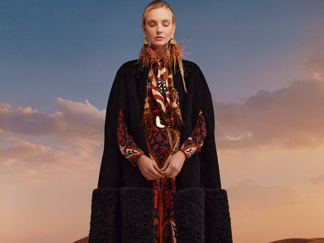 A rich blend of textures—embroidered wools, velvets, silks, and twills—where opulence meets modernity. Suede and denim add raw sophistication, while golden thread-work and jacquards transform jackets and capes into symbols of power. Tailored precision meets fluid movement with ethereal drapes, statement feathers, and intricate embroideries that celebrate heritage craftsmanship and untamed beauty.