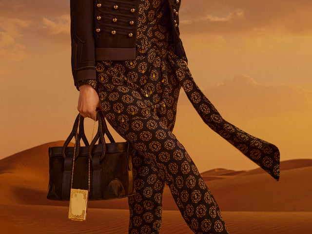This season's accessories embrace a more-is-more spirit, inspired by our muse. Rich in mysticism, heritage craftsmanship, and Western influences, each piece feels like a treasured find. Textures, feathers, gold accents, and symbolic details add movement and stories. From novelty boots to statement jewelry, the collection exudes opulence, femininity, and exquisite elegance.
