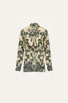 A silk CDC blouse featuring a botanical motif in soft green tones, designed with a gently gathered neckline and a tie at the back that forms a delicate knot detail. Fluid and lightweight, it offers an elegant drape and an effortless feel. Ideal for spring styling, it pairs seamlessly with the matching skirt or with tailored pants for a polished yet relaxed JO look.