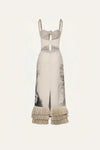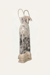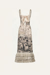 A long dress crafted in linen, featuring a botanical landscape print rendered in black over an ecru base. Designed with delicate straps, a front bow detail, and a softly structured bodice, it flows into a fluid skirt finished with layered fringe at the hem. A distinctive piece with light movement and texture, ideal for spring occasions and warm-weather evenings.