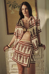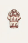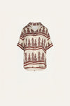 A shirt featuring a JO print, designed with short sleeves and a button-down construction. Perfect for warm-weather dressing and effortless layering. Style it worn open over swimwear or paired with the matching skirt.