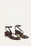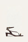 Cow leather sandals designed with slender straps and a sculpted mid-heel for subtle elevation. The gold-tone chain detail adds a refined accent, making them a versatile choice from day to evening.
