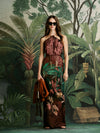 A long dress crafted in printed jacquard, featuring a richly detailed botanical landscape and a subtle sheen. Designed with a halter neckline finished with a chain necklace closure, it offers a striking yet effortless silhouette. Style it with minimal sandals for daytime occasions or elevate it with sculptural accessories for evening wear.